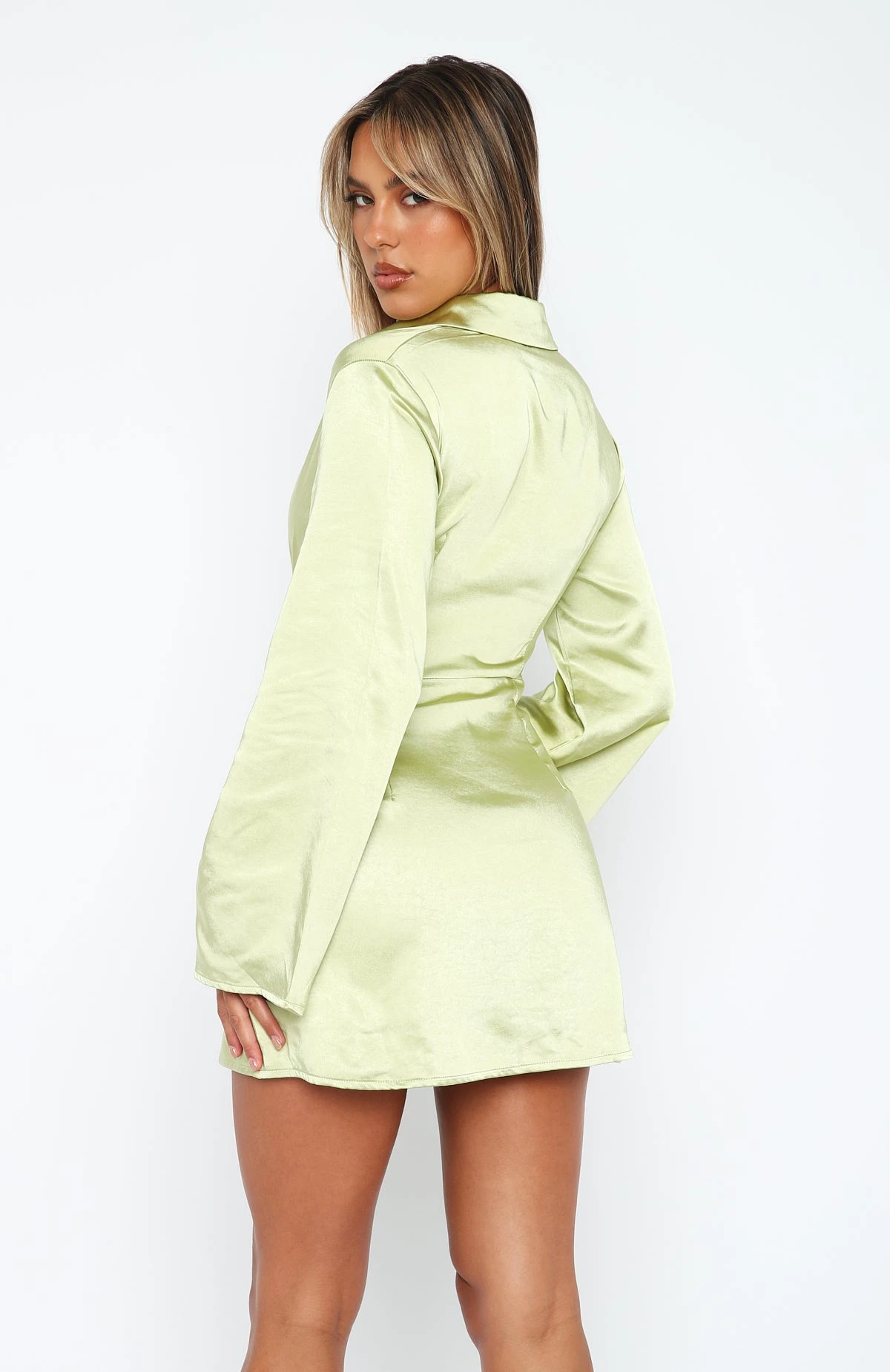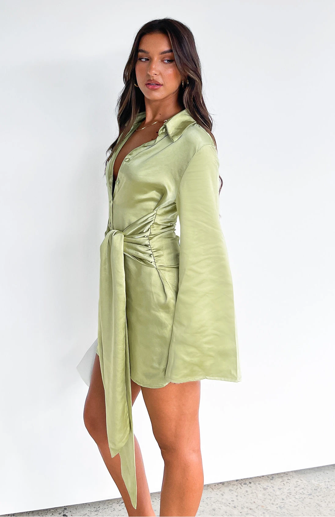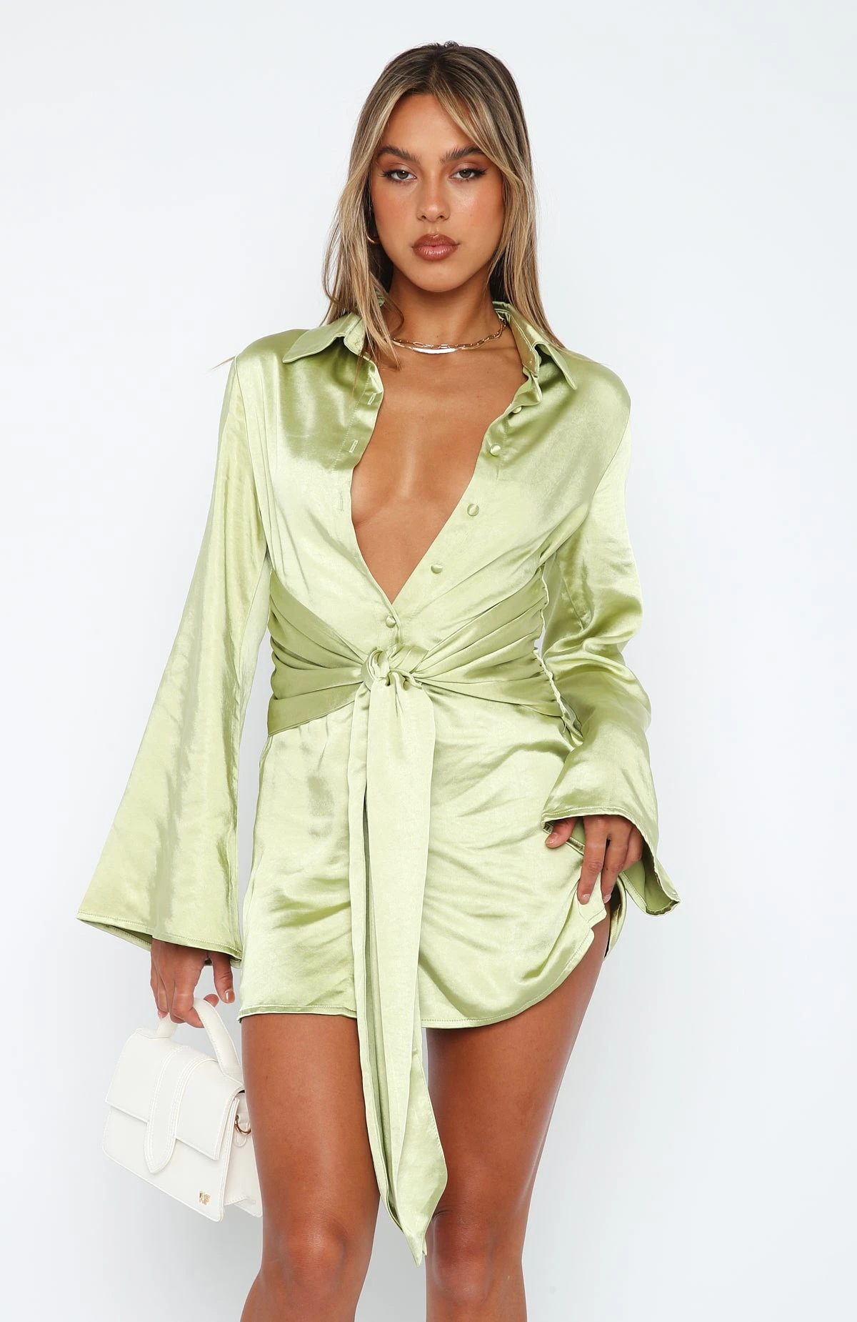 The Night Out Long Sleeve Mini Dress in Matcha speaks for itself. Featuring collared neckline, long sleeves, button-up front closure, front-tie design and lined, silk-feel fabric. Pair with gold accessories and perspex heels and get ready to be best dressed at your next event!Â