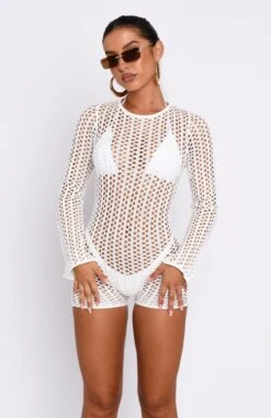 Elegant White Knitted Long Sleeve Playsuit | Resort Wear Collection