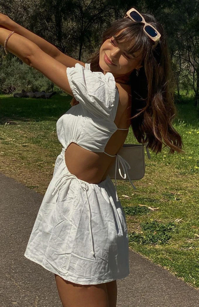 Nail the trend with this super cute dress this season. The Different Girl Mini Dress in White features puff sleeves, square neckline, elasticated waist band, cut out waist, lined and backless design with ties. Team this with heeled mules and a cute shoulder bag for a brunch date with the dolls.