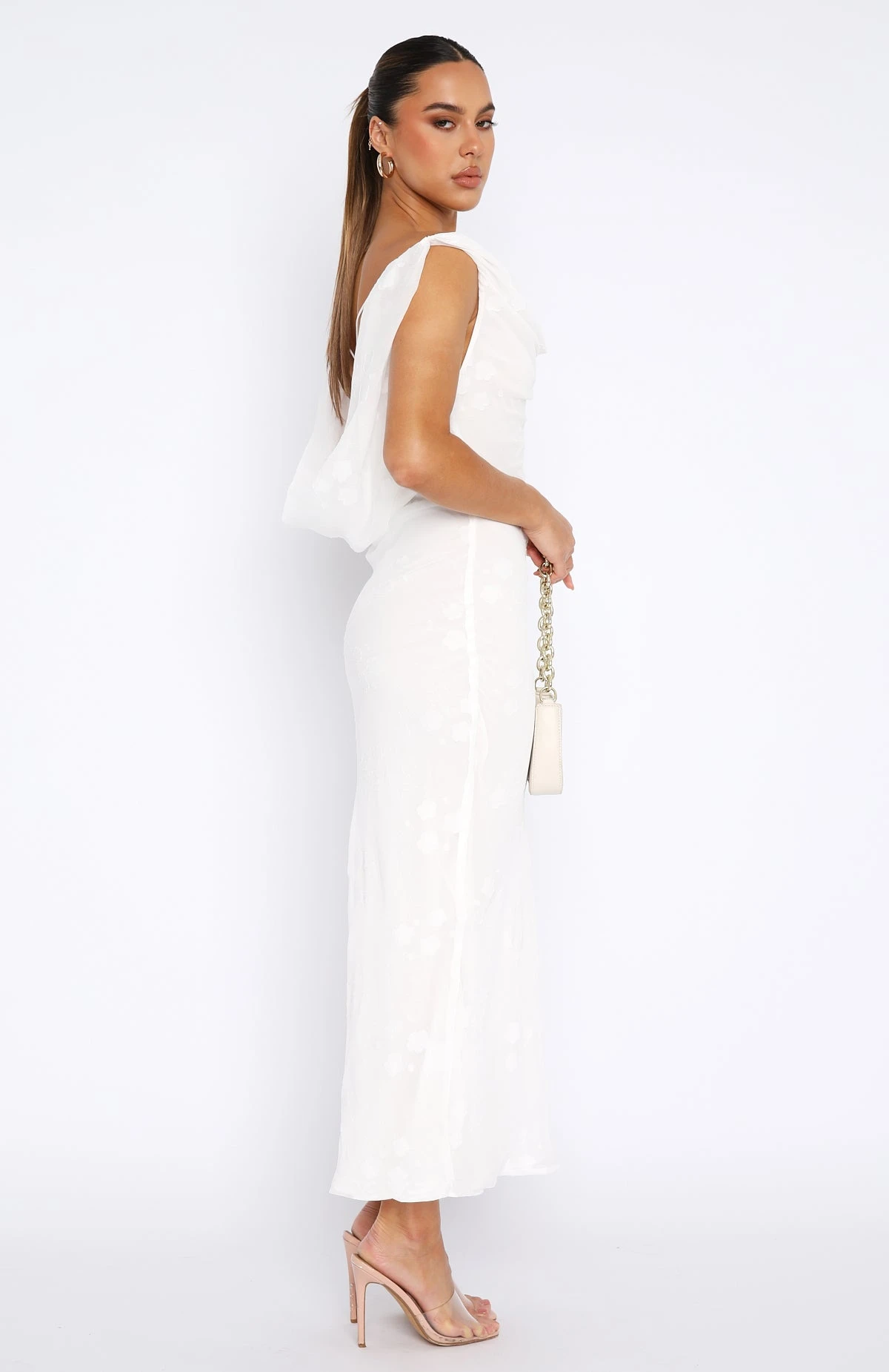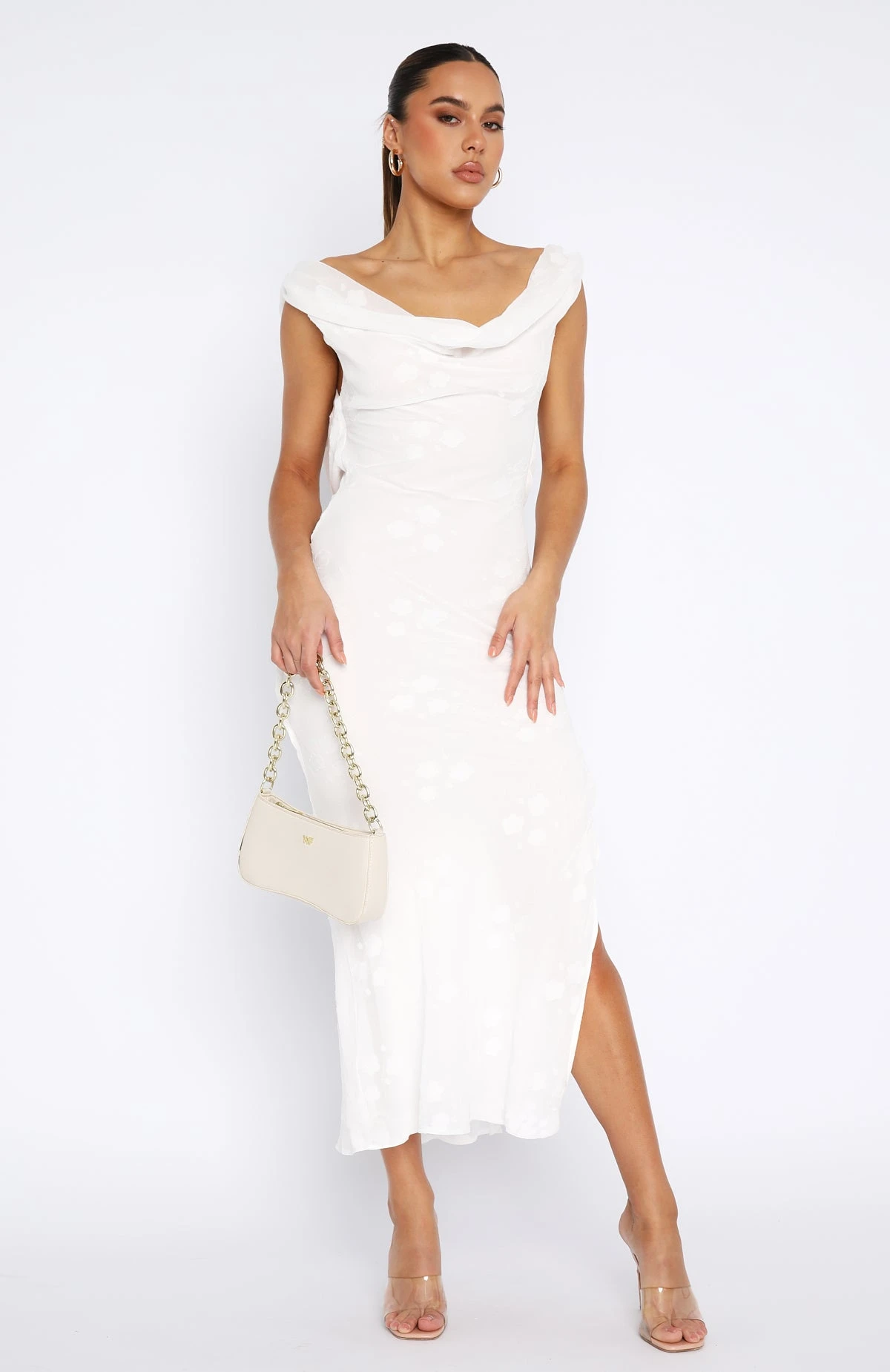 A flirty, fuss-free dress that still does all the talking, clingy in the right places and as comfortable as ever. The This Is The Year Maxi Dress White features a plunging neckline, slight off the shoulder fit, thin cross over straps at back, backless design, maxi length, high side split and lined, semi sheer fabric. Pair with subtle gold jewellery and mules for feminine and classy look!